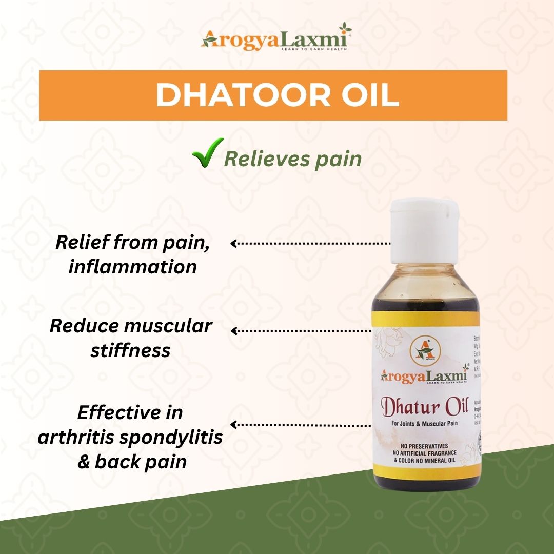 A specially formulated Ayurvedic oil, ArogyaLaxmi Dhatoor Tail is designed to provide relief from pain, inflammation, and muscle stiffness. This natural blend of powerful ingredients penetrates deeply into the affected area, offering soothing relief for joint and muscle pain.